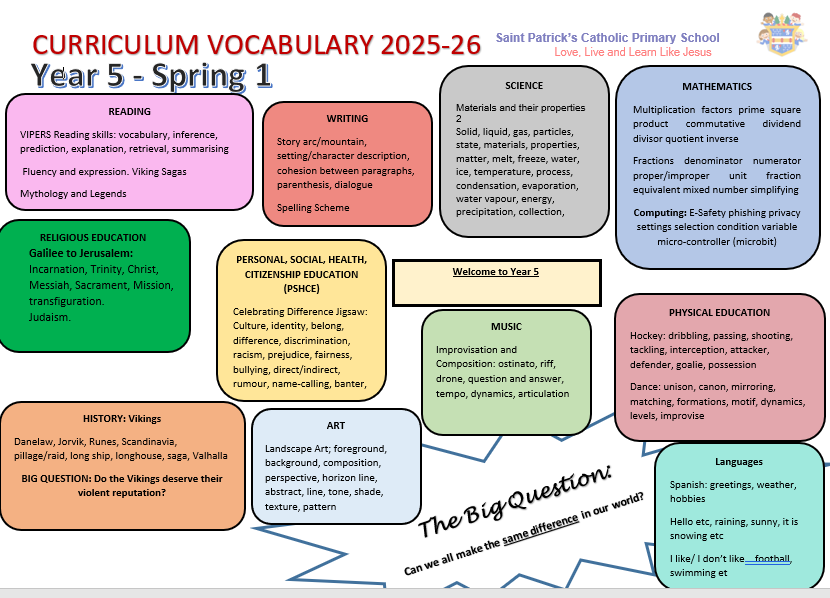 This term we will be reading ‘The Vikings: Raiders, Traders and Adventurers’ by Marcia Williams and learning all about this period of history with a particular focus on their myths or sagas as they are called. We will be acting out parts the sagas and writing our own versions using Year 5 standard writing to make our stories engaging and full of description and action. In Maths, we be working on fractions before moving onto more multiplication and division and more problem solving. In P.E, we will be playing hockey and learning some dances. In computing, we will be learning how to use coding to program our microbits. In Art, we will be learning all about landscape art and we will create our own Viking landscapes. Our Science is continuing the topic of materials and will involve some experiments to discover how different materials behave. In R.E, we will be exploring the unit on ‘Galilee to Jerusalem’ and we will be studying the ‘Sermon on the Mount’ and the transfiguration. Our PHSE is ‘Celebrating Difference’ Jigsaw programme and looks at how we can uphold the British values of tolerance, respect, democracy, liberty and rule of law. .