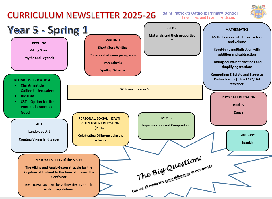 This term we will be reading ‘The Vikings: Raiders, Traders and Adventurers’ by Marcia Williams and learning all about this period of history with a particular focus on their myths or sagas as they are called. We will be acting out parts the sagas and writing our own versions using Year 5 standard writing to make our stories engaging and full of description and action. In Maths, we be working on fractions before moving onto more multiplication and division and more problem solving. In P.E, we will be playing hockey and learning some dances. In computing, we will be learning how to use coding to program our microbits. In Art, we will be learning all about landscape art and we will create our own Viking landscapes. Our Science is continuing the topic of materials and will involve some experiments to discover how different materials behave. In R.E, we will be exploring the unit on ‘Galilee to Jerusalem’ and we will be studying the ‘Sermon on the Mount’ and the transfiguration. Our PHSE is ‘Celebrating Difference’ Jigsaw programme and looks at how we can uphold the British values of tolerance, respect, democracy, liberty and rule of law. .